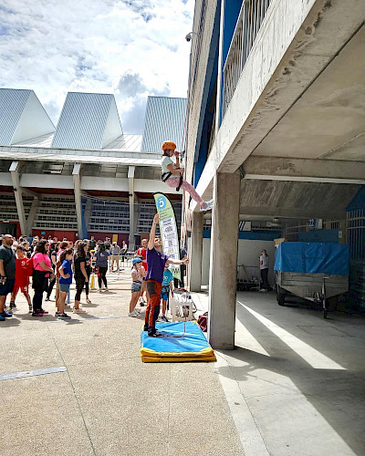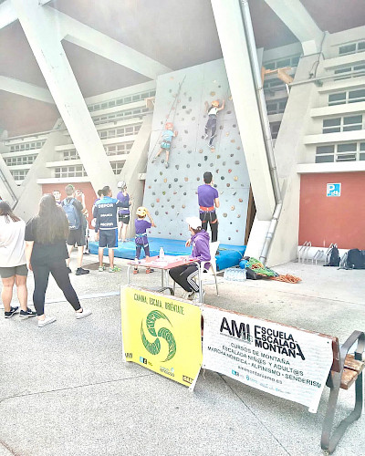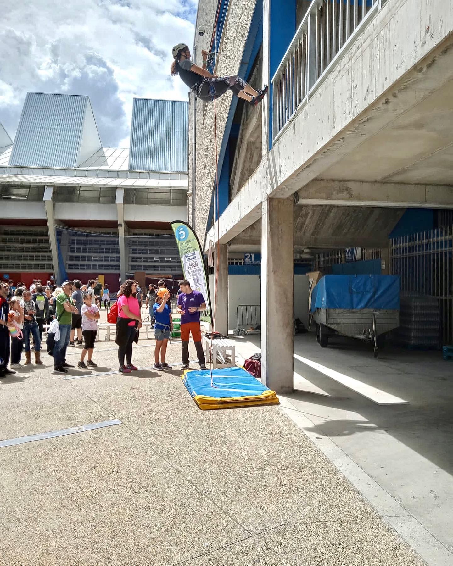 A través de una pequeña trepada en el rocódromo exterior del Palacio de los Deportes y un pequeño rapel.